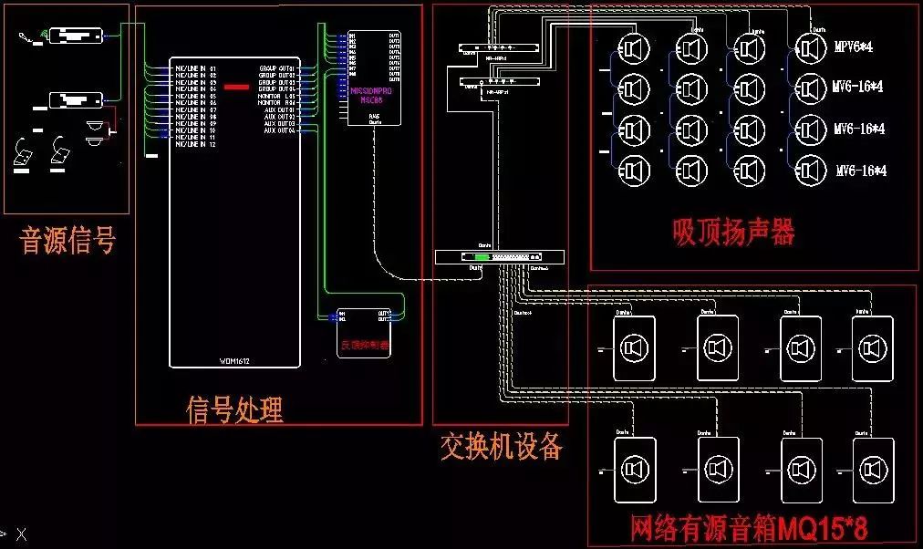 MQ-15为15寸有源音箱,通过Dante传输进入主交换机;MVP6内置功放Dante网络传输的吸顶音箱,每只吸顶喇叭通过音箱线并联三只MV6-16,最终通过一根网线进入系统MR-4RP交换机,同时给MVP6吸顶24V供电;MR-4RP通过网线连接主交换机。调音台输出模拟信号给音频处理器,音频处理器通过网线连接主交换机,无需输出模拟信号,通过Dante网络传输协议进行数据处理。最终以Dante controller软件进行通道配备选择。