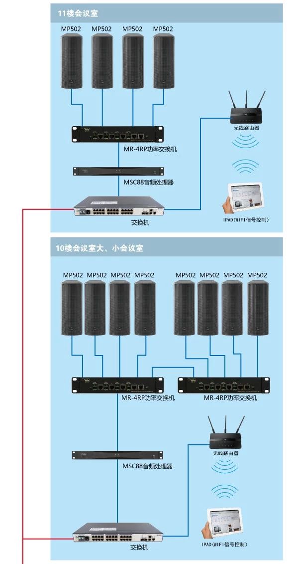 在此次项目设计中,工程商选用了Mission Pro MP全频系列中的MP-502作为会议室和多功能厅的主扩扬声器。MP-502为双5.5寸有源壁挂音箱,内置Dante与D类功放模块,通过一根网线进入系统MR-4RP功率交换机;MR-4RP通过网线连接MSC-88音频处理器,最终通过网线连接主交换机,无需输出模拟信号,通过Dante网络传输协议进行数据处理。整座大厦采用了整合性极高的多功能分布式云控制系统。