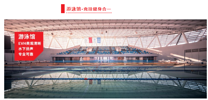 游泳馆除了设有标准竞赛游泳池、训练池外,还设有各种水疗休闲设施、部分水上用品商业以及儿童娱乐池和滑道等,供普通市民休闲娱乐使用。在游泳馆顶部,业主同样选用了白色EVH系列扬声器,在美观度和品质方面和场馆高度统一。
