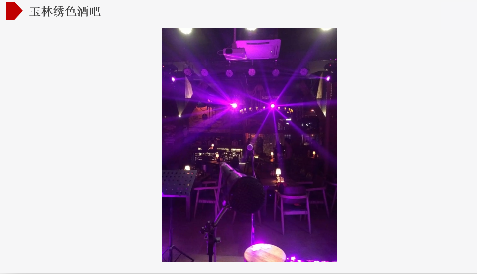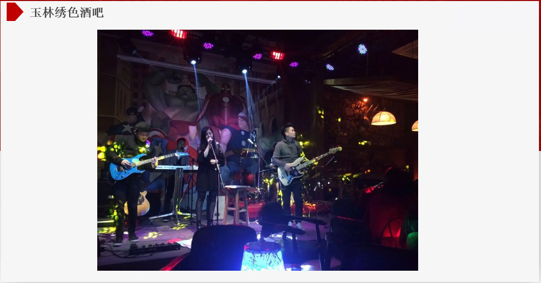 绣色酒吧是玉林市为数不多的现场乐队类型的酒吧,开张之后,生意火爆,并经常邀请国内外的实力派歌手驻场,演奏。