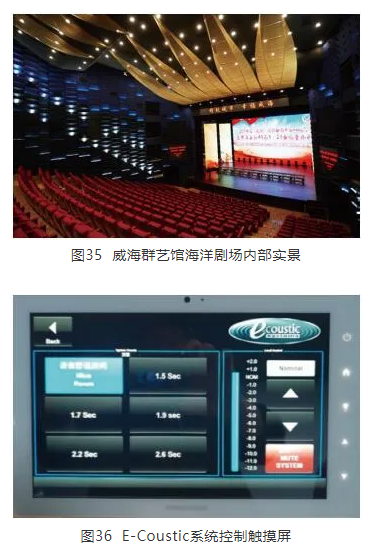 如前所述,E-Coustic系统基于世界最著名的专业混响器研发生产企业Lexicon而来,其独到的混响算法为这种嵌入式系统提供了一个非常好的再生听感,同时E-Coustic先进的时变迅雷AV黄色成人麻豆,也很好地保证了系统的稳定性。本系统中,传声器与扬声器的距离很近,但很好地抑制了声反馈和声染色的问题。同时系统使用较少的传声器-扬声器通路,即能达到改变声学环境的效果,也很大程度的降低了施工难度,这也是嵌入式系统的固有优势之一。威海市群艺馆海洋剧场内部实景及E-Coustic控制触摸屏分别如图35和图36所示。