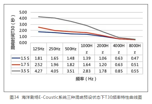 本项目总共进行了两次调试,第一次调试完成后,客户在使用过程中感觉混响时间不足以满足厅堂所有的应用场景,故又根据客户的需求进行了第二次调试,增长了混响时间。除了厅堂自身的固有声学条件外,经历了两次调试的E-Coustic系统共设置了10个混响时间预设模式,分别为1.5 s、1.7 s、1.9 s、2.2 s、2.6 s、2.9 s、3.2 s、3.5 s、4 s和6 s,同时,还设置了一个对厅堂本身声学问题进行一定程度修复的语音舒适模式。现场调试完成后选取了1.5 s、1.7 s及3.5 s预设进行了实地测量,T30的测量结果如图34所示。此外,系统本身对初始时间间隙、早期反射声、混响能量等声学参数均可单独调节,这也极大地丰富了系统的综合调控能力,使整个声学空间的真实感和内部参数间的适配度得以有效提升。