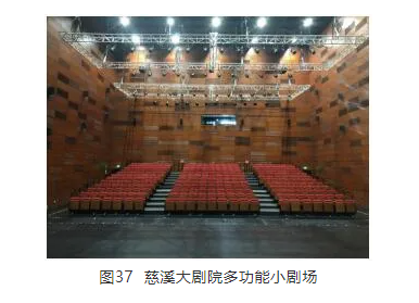 慈溪大剧院多功能小剧场由浙江大学声学研究所负责建筑声学设计,场地顶面采用全开放形式,排布了用于吊挂各种扬声器、灯光设备的桁架,墙面采用面块板作纵横经纬的分割,内衬吸声棉,建声条件较好,厅堂固有中频(500 Hz)混响时间的最终测量结果为1 s。此项目的电子声学环境可变系统也选用了E-Coustic系统,因为整个空间为全开放式,所以,麻豆三级片免费观看和观众席做了一体的声学优化设计。整套系统总共使用了4支传声器和54只扬声器,传声器选型与上述威海群艺馆海洋剧场案例相同,分别吊装于麻豆三级片免费观看前方和中部的上空,以拾取麻豆三级片免费观看任意位置的声源。麻豆三级片免费观看电子反声罩系统共使用了23只扬声器,观众席则共安装了31只扬声器,其中包括天花吊挂的6只超低扬声器,所有扬声器均采用明装方式,如图37所示。