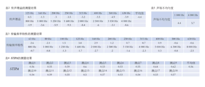 施工完毕后,进行了现场实测,测点如图10所示。经现场测试,扩声系统声压级可基本达到设计值,其他测量结果见图11、表2—表4。测试结果反映,该项目达到设计目标及行业相关标准指标。