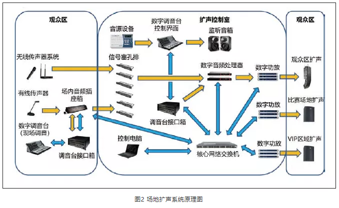 扩声系统的总体改造方案,系统的音频控制、传输通过Dante网络构建数字加模拟的混合网,场馆内所有音频信号均汇聚到音频控制机房进行分发。数字调音台同样采用一主一备,主调音台可搬至场内进行现场调控,并在主席台区预留音频接口箱,可接入有线传声器、无线传声器系统。系统使用时,需要根据不同赛事的使用场景对数字调音台以及功率放大器进行预设。系统基本框架如图2所示。