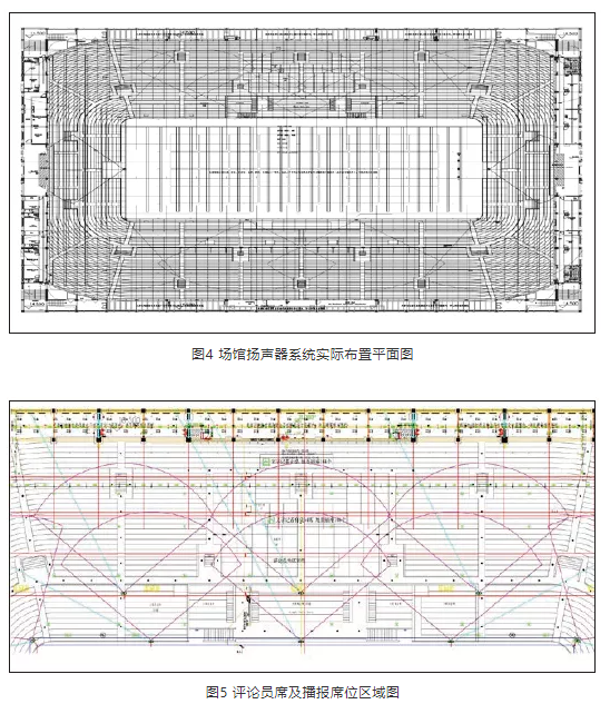 对于声场的设计,扬声器系统既考虑主席台区的覆盖,又要考虑整个观众区的覆盖;在扬声器选型上,要符合重量要轻、体积小、声压大等性能,以满足承重、避免建声缺陷、提高语言清晰度、避让视频照明等其他设备等一系列的相关要求。通过仿真软件NS-1模拟设计,确定扬声器数量、吊挂高度、投射角度等,以达到体育建筑设计规范一级指标,声压级为105 dB,语音清晰度指数不小于0.5,声场模拟点位如图3所示。不同的区域根据实际的面积、纵深覆盖需求,对线阵列扬声器的数量、分频、吊挂角度与高度进行配置。主扩声扬声器系统采用14组双12英寸三分频无源全频线阵列扬声器,吊挂覆盖整个观众区。其中,北侧方向共分8组,每组根据覆盖区域分别由2~8只扬声器单元组成;东西方向各1组,每组4只扬声器单元;南侧方向共分4组,每组根据覆盖区域分别由4~8只扬声器单元组成。扬声器布置平面图如图4所示。以评论员席以及播报席区域为例,由于区域观众席第一排至最后一排的高差为15 m,如图5所示,因此使用了2组线阵列扬声器进行覆盖,分别使用了4只、7只扬声器单元,其吊挂角度、高度分别为-7°、20.5 m,-2°、17.9 m,如图6所示。