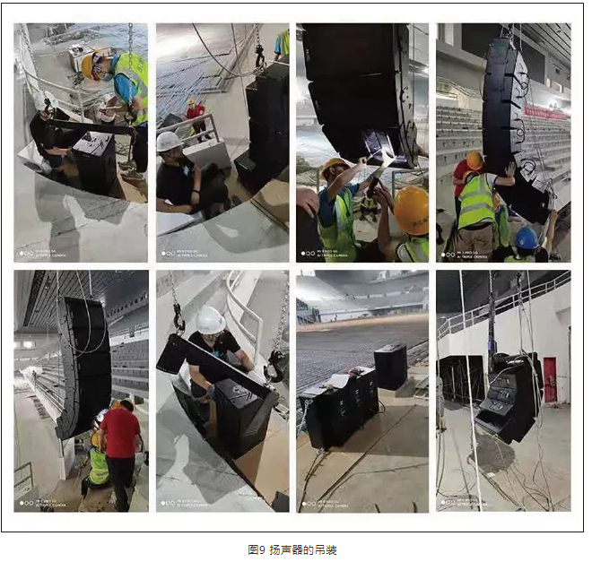 在扬声器系统吊挂过程中,由于首都体育馆保留了原有大顶球型网架结构、马道,在球型网架的结构下还有铝板造型结构以及龙骨,而扬声器系统的吊挂点位于大厅顶层铝板之上,需要穿过结构下悬杆、铝板和铝板固定龙骨层,避开灯光线路以及马道,并且每一组线阵列扬声器的安装位置不相同,需要精确的定位,以满足现场覆盖的范围及角度。基于这种情况,在进行了实地勘察测量后,经各方讨论,最后选择了单独设计安装钢结构吊点的吊挂方式。根据现场不同的位置,定制吊挂扬声器的钢架,如图7、图8、图9所示,吊挂高度可以在钢架上调整。这一结构不仅可以避开场地照明光路等,还可以应对施工过程中马道等一些设施的更改。