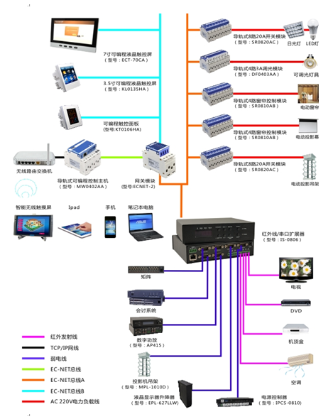 由若干个EC-NET总线A电箱,总控室EC-NET总线B,及主机、网关的系统模块构成。