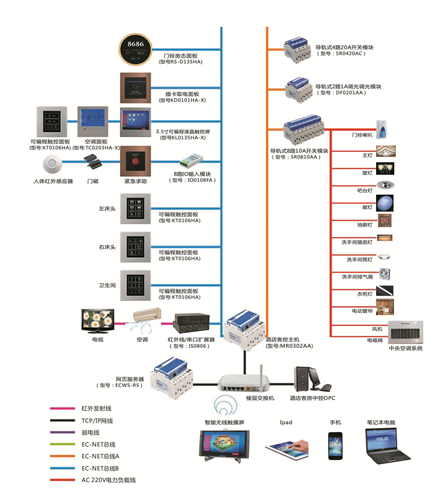 智能酒店客房控制系统    基本功能:照明开关、电动窗帘开合、插座控制、空调本地控制、空调联网控制、背景音乐控制、模式控制、房态监视。