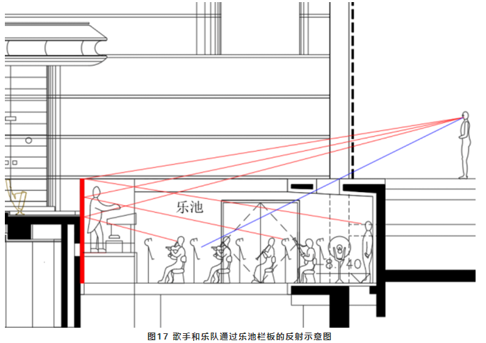 由于乐池的下沉,歌手和乐队彼此之间大多数看不到对方,也就是说他们之间缺乏直达声进行交流,通过反射面提供<35ms的早期反射声进行交流就至关重要。乐池栏板是歌手和乐队之间最近的反射面(见图17),因此栏板必须是硬的反射面。苏州湾大剧院乐池的右侧栏板采用透空做法(见图18),优点是可以提高了乐队的声级特别是高频声,增加乐队演奏声的亮度。但是却产生了三个不利因素:一是打破了歌手和乐队之间的平衡,使乐队声能可能盖过了歌手;二是减少了歌手和乐队之间的早期反射声交流,不利于演出的同步性;三是观众可以隐约看到乐谱灯光,干扰观看演出。综合考虑这种做法并不可取。